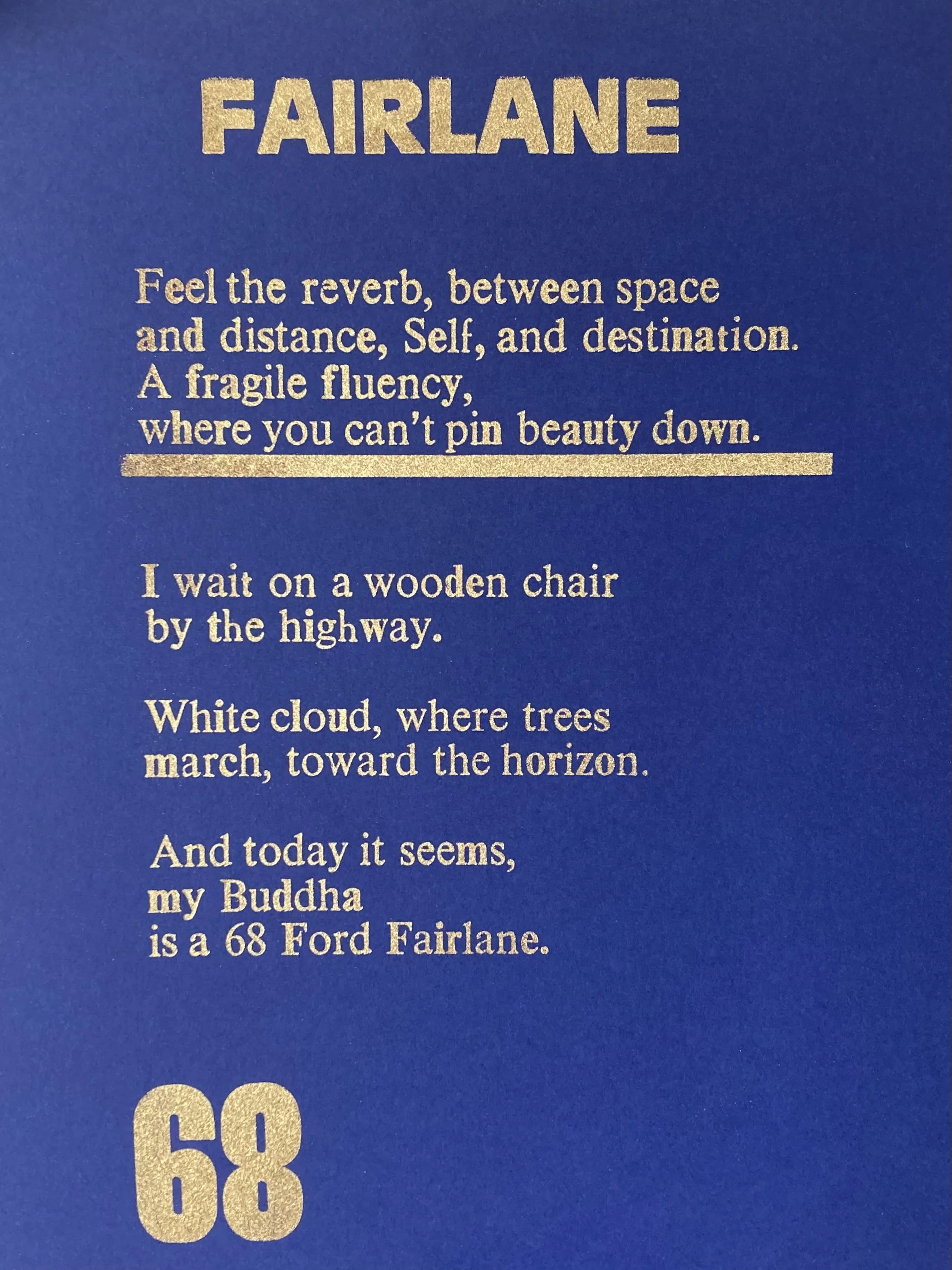 Poem about a 68 Ford Fairlane. I’d never seen one before. Set it in lead, rolled black ink, hit it with gold powder…